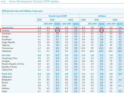 Недавно был опубликован доклад Азиатского банка развития под названием «Перспективы развития Азии», согласно которому в 2019 году экономический рост Армении прогнозируется на уровне 4,8%, а уровень инфляции составит 3%. А для 2020 года прогнозируется рост ВВП на 4,5% при инфляции в 3,2%.