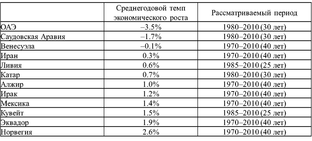 Иллюстрацией может послужить среднегодовые темпы долгосрочного экономического роста некоторых богатых ресурсами стран (Источник: World Bank, World Development Indicators http://databank.worldbank.org/data) (смотри иллюстрацию)