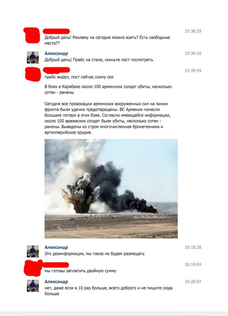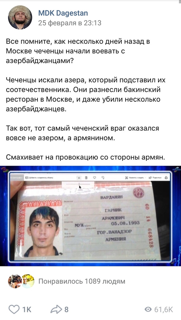 В конфликте азербайджанцев с чеченцами, где, по мнению журнашлюхи Фуада Аббасова, виноваты почему-то армяне, тоже применялся этот метод. Так они разместили в паблике МДК_Дагестан (думаю, не стоит описывать его аудиторию) откровенно пропагандистский пост с "виновником" конфликта, чтобы сотни тысяч "кауказских_жиесть_братьев_леее_повере" увидели и поняли, кто настоящий враг! А цена услуги всего 500 рублей, что, уж простите, дешевле проститутки. Видимо, для создания народа-гоюна все средства хороши.