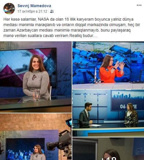 Несколько месяцев со страниц азербайджанских пользователей сетей не сходила некая Севиндж Мамедова - сотрудница Национального управления по аэронавтике и исследованию космического пространства (NASA). В одном из своих постов сама Мамедова рассказала о том, что родилась в 1979 году в Баку, уже 9 лет живет в США и является космическим пилотом первого класса в NASA. На историю «космического» успеха Севиндж Мамедовой повелись многие ее земляки в соцсетях, пишущих восторженные комментарии под снимками псевдо-астронавта. Среди тех, кто повелся на фейковую историю, были и представители азербайджанских СМИ, сделавшие интервью с Мамедовой через ее личную страницу в Фейсбуке. Спустя три месяца оказалось,, что все снимки, которые Севиндж.Мамедова выдавала за свои, принадлежат Пранвере Хусени из Косово, которая является основателем и директором Косовского астрономического центра. После такого разоблачения, Севиндж Мамедова заблокировала всех своих почитателей на личной странице в Фейсбуке. До сих пор азербайджанцам не ясно кто скрывается за этим человеком и зачем ему понадобилось "примерять" чужую фотографию и успехи себе.