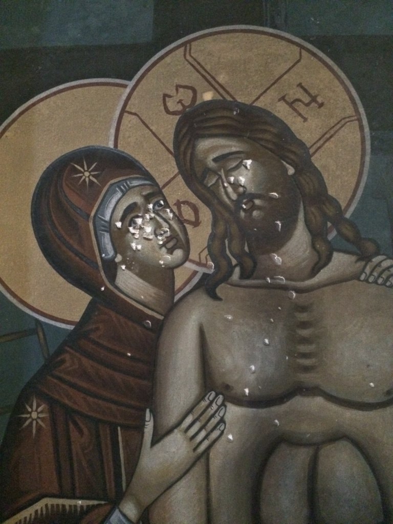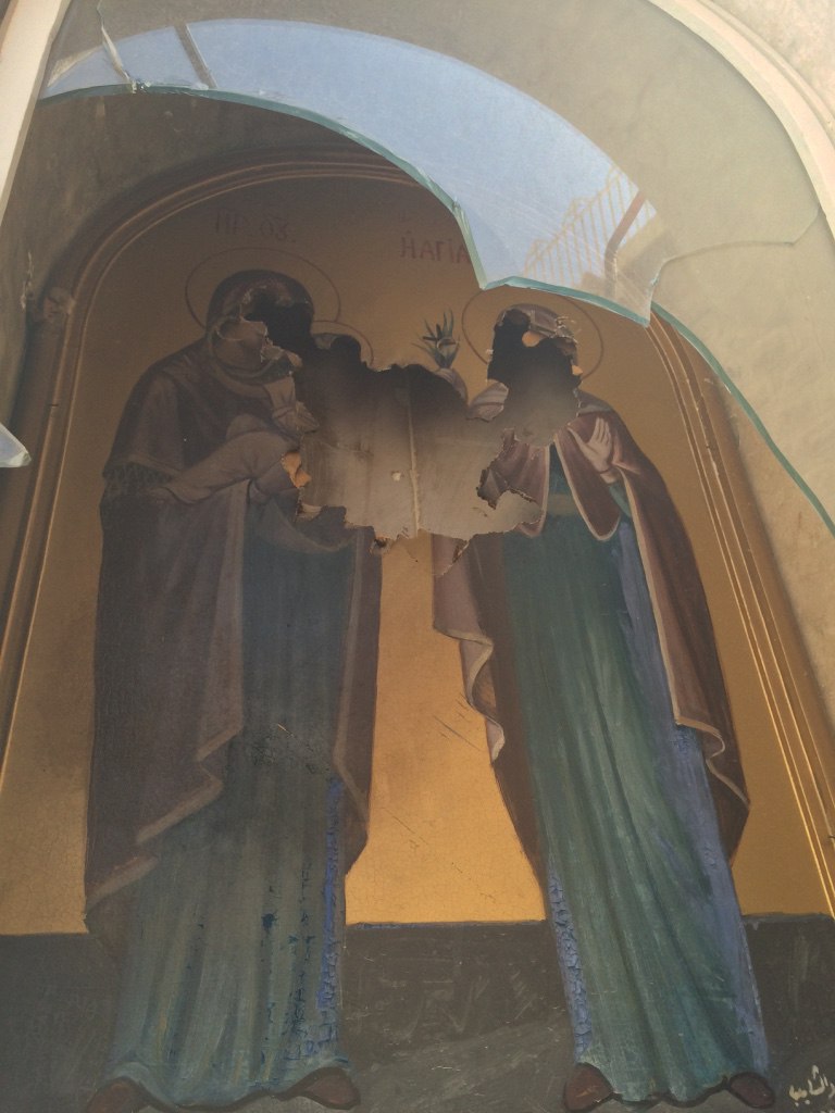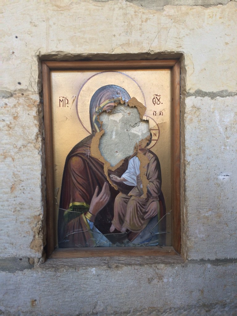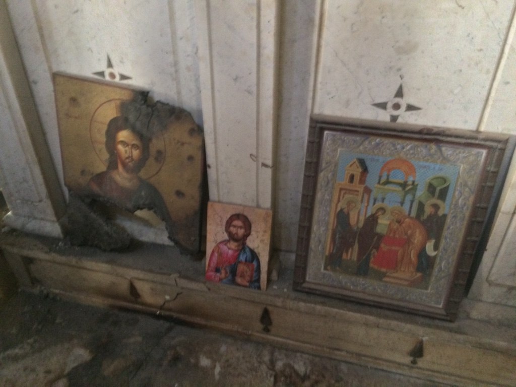 Антитопор готовит телерепортаж о Сирии. Пока пишется сценарий и монтируется к производству фильм, предоставляем вашему вниманию стоп-кадры, сделанные нашей командой во время посещения старейшего на земле христианского монастыря в сирийской Маалюле. Как известно, городок был захвачен бандитами ИГ. Однако полгода назад сирийская армия освободила Маалюлю. Перед вами кадры сожённых и разбитых икон (на некоторых видны и следы от пулеметных очередей), совершенных вандалами-исламистами.