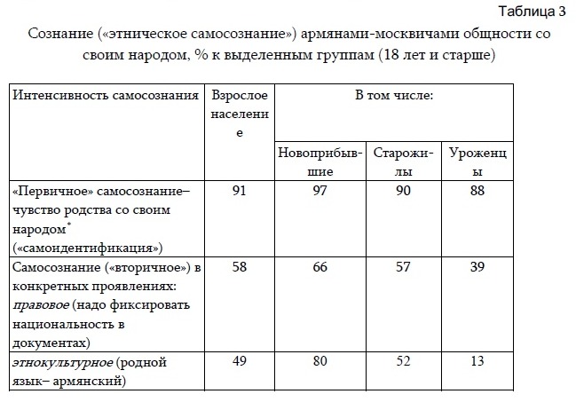 Выборка конечно не показывает того, насколько эти самые армяне чувствуют себя связанными со своей родиной. И хоть другая таблица показывает, что армяне столицы как минимум считают себя в большинстве частью армянской нации, то это не всегда может дать точный результат. Качественный вопрос- "как точно они соответствуют армянским ценностям?" навряд ли может быть когда-либо отвечен ввиду чрезмерной сложности исследования, да и вообще из-за множества трактовок.