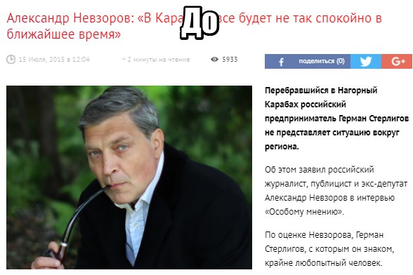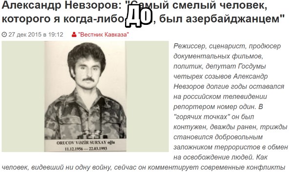 P.S.: На самом деле, тут можно было бы рассказать ещё о многом. О том, как своего вчерашнего идола оппоненты сегодня пытаются представить в качестве «друга армян» и даже пытаются упрекнуть армян(!), в том сколь низко последние пали, раз нуждаются в таких друзьях. Или о том, как меняются фотографии для публикаций. Если к статьям о герое Визире и псковских десантниках подкреплялись фотографии публициста в задумчивой позе курящего трубку, то сегодня со страниц азербайджанских сайтов на нас смотрит неказистый «Сашка-дурачок». Но, пожалуй, и сказанного вполне достаточно.