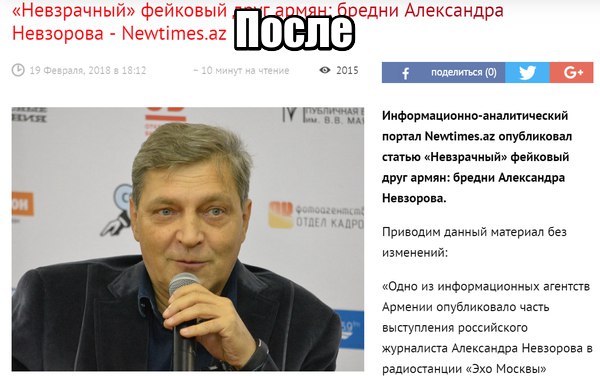 Ни для кого не секрет, что в Баку с особым трепетом относятся как к армянофобам, так и к любым авторам тех или иных концепций, которые играют на руку местному агитпропу и с животной ненавистью к тем, кто на целостность этих самых концепций посягает. Отношения с Невзоровым пережили классические три этапа отношений.