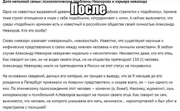 Реакция последовала незамедлительно. И следует признать это был не совсем тот ответ, который ожидаешь от интеллектуально полноценного собеседника. Вместо «Ты Саша, конечно хорош, но вот Ильхата не трожь!», Невзоров получил целую подборку отборнейших ругательств: лживый армяноподобный ишак, невзрачный фейк, дитя неполной семьи, сын наркоторговца и распутницы, инвалид, морально неказистый урод и вообще сумасшедший.