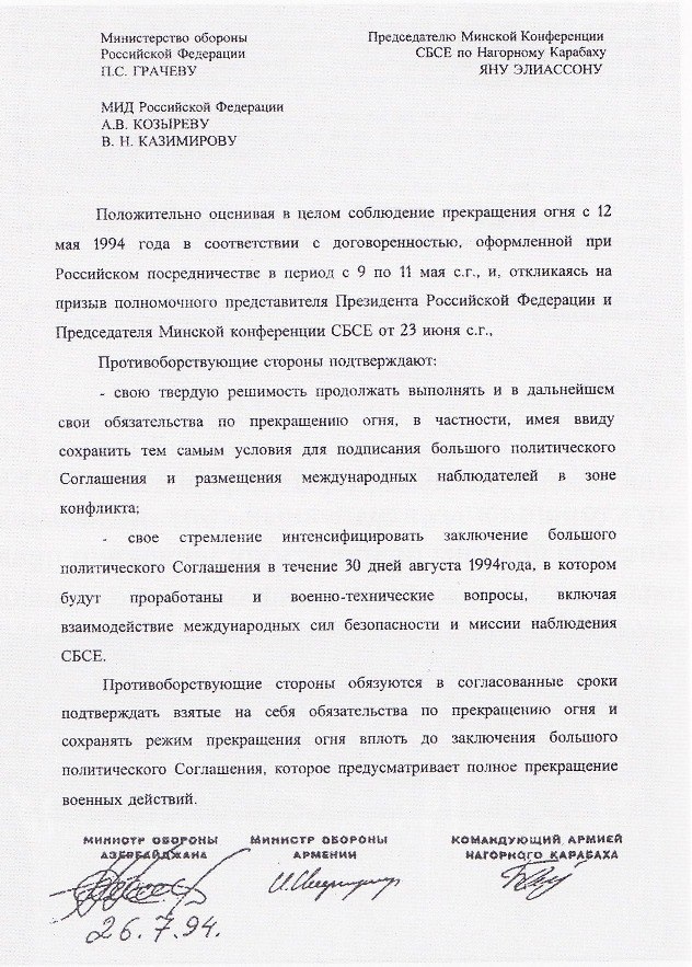 Ниже представлено соглашение о прекращении огня между сторонами конфликта, где есть подпись командующего Армией Обороны Арцаха (НКР).